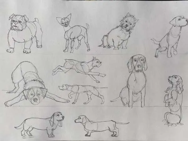 Canines have long, flexible spines, so don’t draw them stiff. Give the line a natural curve, even when the dog is standing still.